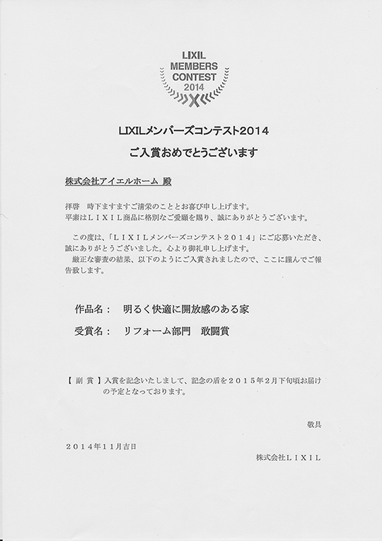 住宅コンテスト『LIXILメンバーズコンテスト2014』に入賞しました!!入賞作品→深堀町アメリカン風住宅 LIXILメンバーズコンテストは業界最大級の住宅コンテストで、より快適な住空間の創造をした作品を表彰するものです。